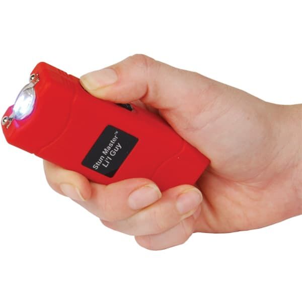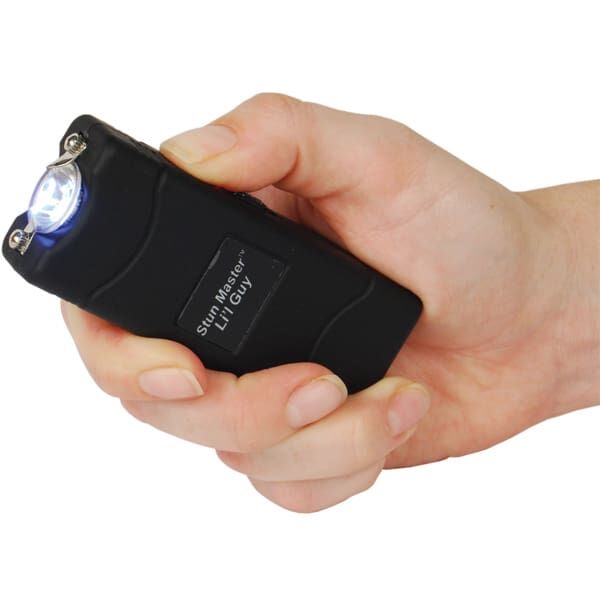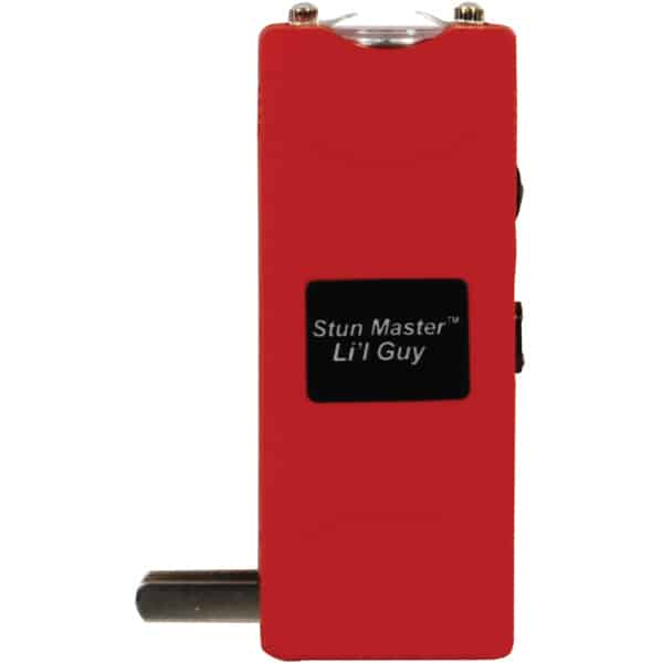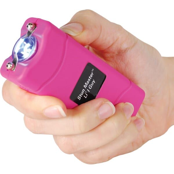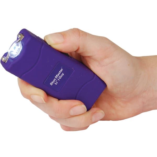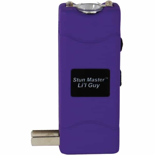 Lil Guy 60,000,000 volts Stun Gun W/flashlight and Nylon Holster. This little stun gun is small and compact with 4.4 milliamps depending on the freshness of the batteries. It has a super bright, 100 Lumen, LED flashlight built in charger and comes with a nylon case. It measures only 3 3⁄4″ x 1 1⁄2″ x 3⁄4″. The safety switch is off when in the down position, middle position is the super bright LED flashlight, and in the up position the shock is turned on once the trigger is pressed. Available in Black, Pink, Purple, Red, Blue, Animal Print.